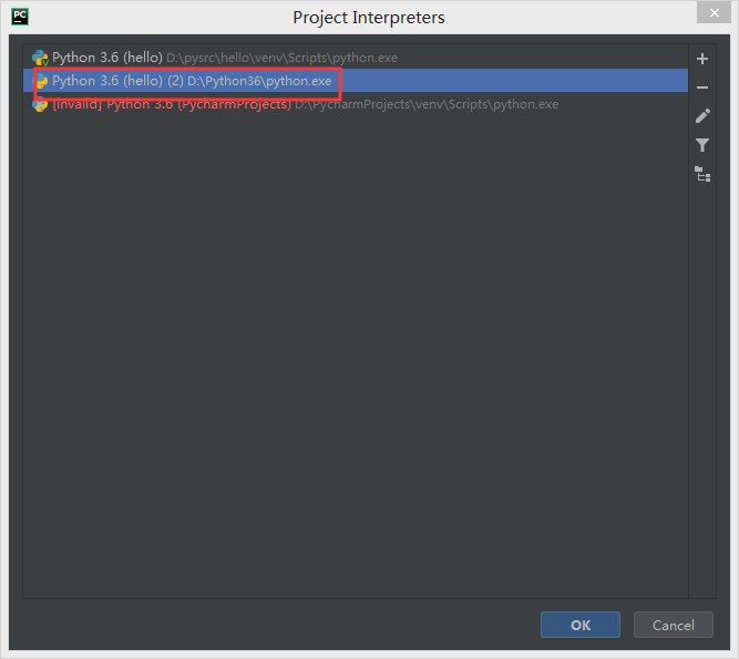 我的python安装在D:\Python36 目录下,现在,我要讲hello项目的解释器修改为这里的解释器